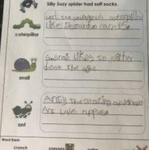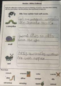 James has been using David Walliams as inspiration for his picture this week, completing a scavenger hunt and working really hard on his handwriting. Good job James!